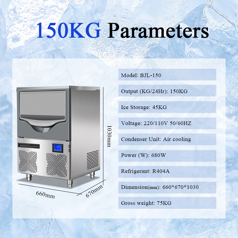 The 150 kg granular/nugget/crushed ice maker are often found in hospitals, restaurants, Colleges and Universities Scientific Research and fast food industries.